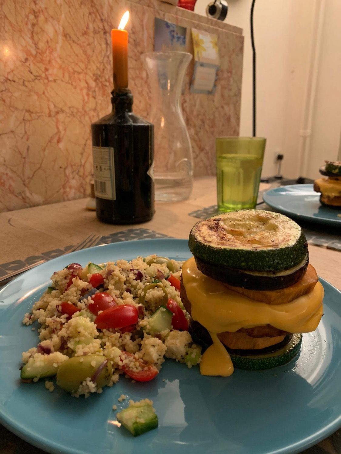 Composez un burger avec la patate douce, la courgette, l'aubergine et les burgers.